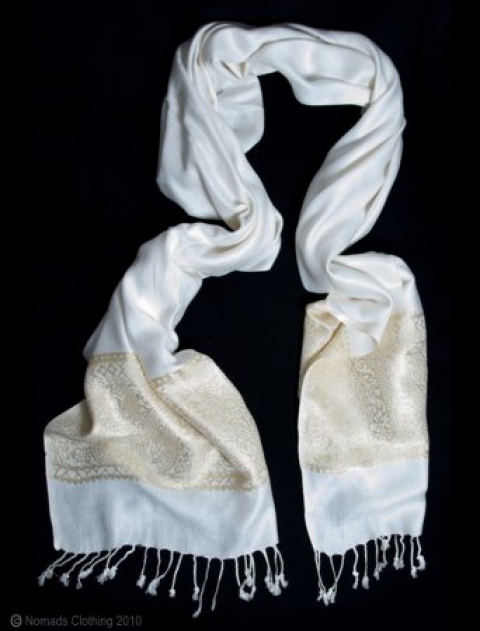 Pashmina-leg slæða úr viscose með gylltum áþrykktum borða.